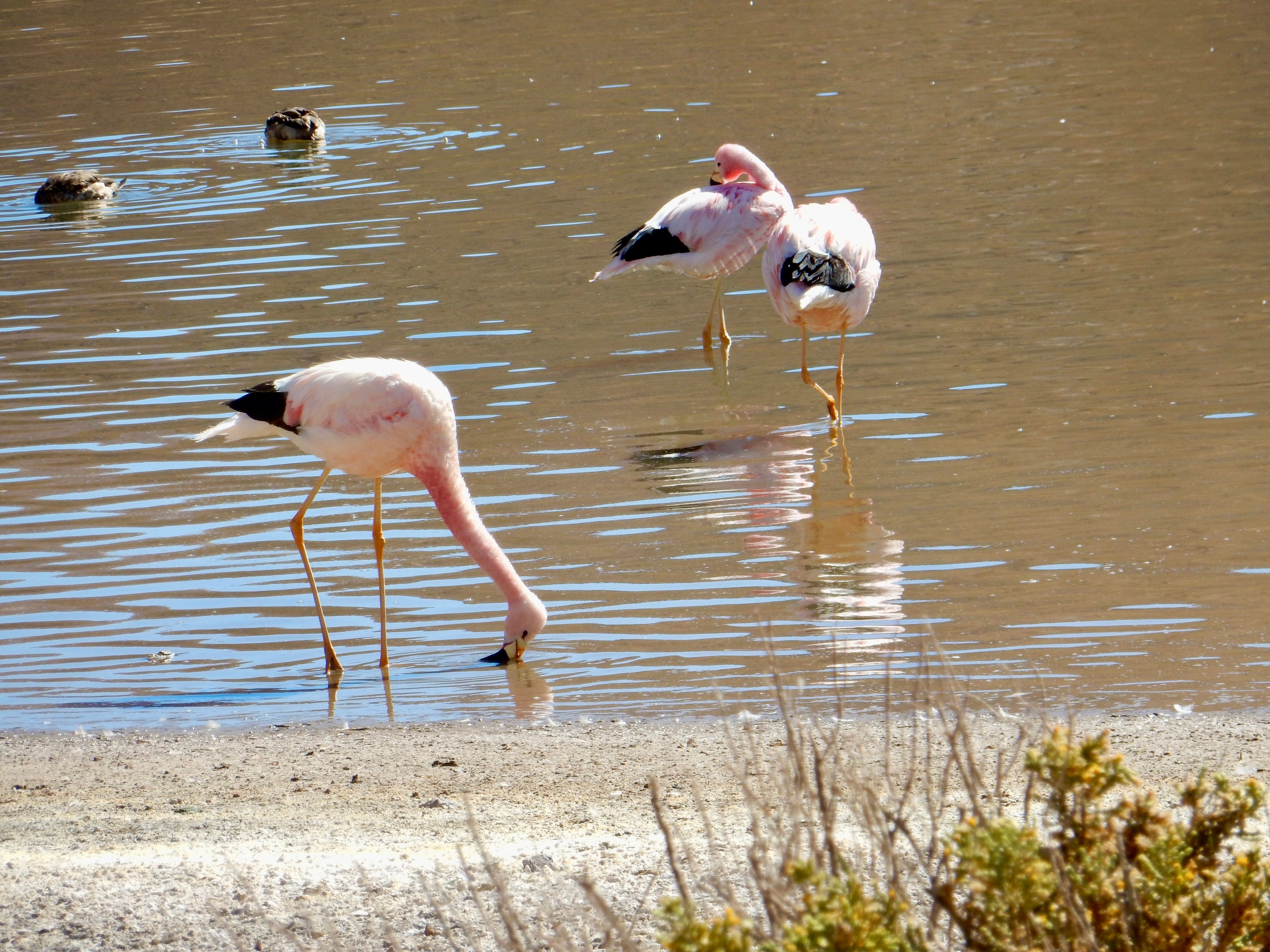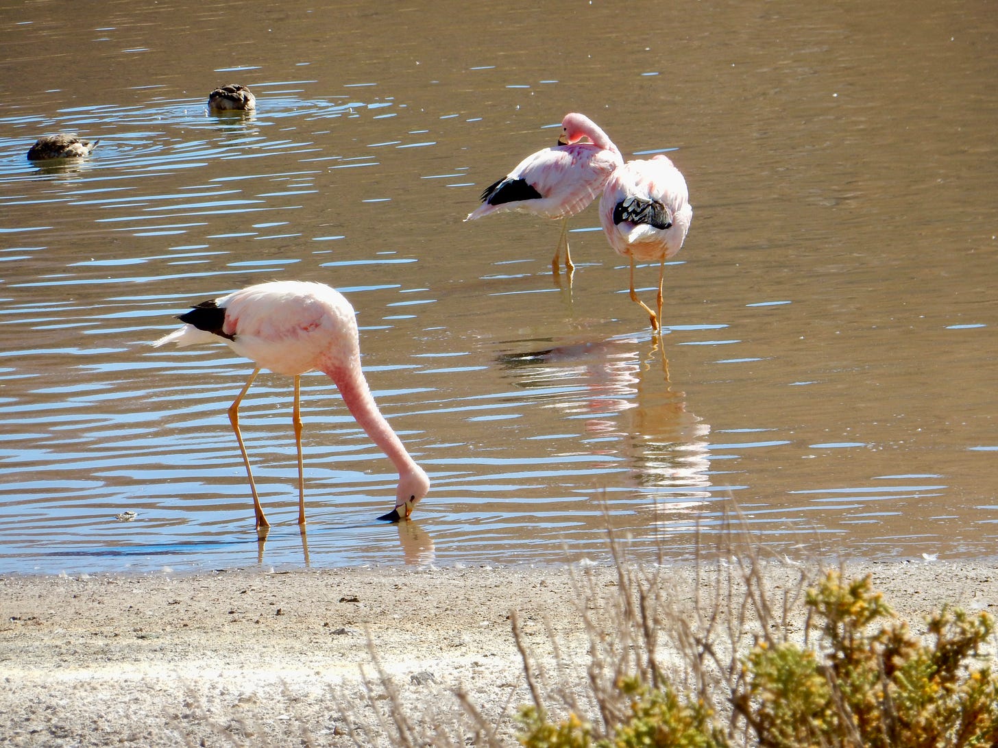 Answer: While dwindling in numbers, three species of flamingoes have been coming to the lagoons in the Atacama salt flats for at least 11,000 years. They come for the brine shrimp which thrive in the lagoons that are fed from fresh-water snowmelt, mixed with the indigenous salt (Halite- mineral form of salt). It is from the brine shrimp that the birds secure their curious pink color.