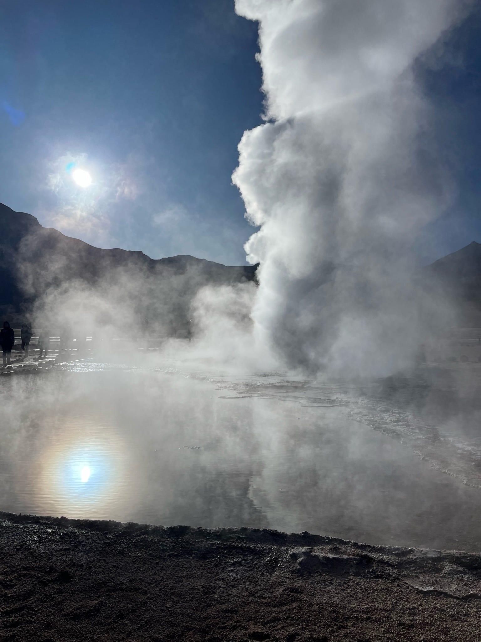 Surrounding San Pedro are some of the most fascinating geologic wonders of the world including the Valley of Moon (Valle de Luna) with towering sand dunes and fantastically eroded basaltic rock formations; the high altitude Salt Flats (4800m/15,748 ft. above sea level) with the unreal looking Laguna Baltinache (seven turquoise lagoons imbedded in salt); the magnificent volcanic and perfect cone volcano Licancabur, and the creme de la creme, El Tatio Geysers, the third largest geothermal field and highest geysers in the world at a staggering 14,170 ft. While visiting the geysers we also had the privilege of takin in the Atacama Salt Deposits, at a slightly lower elevation with their lagoons sporting three types of Flamingoes (yes, a very surreal sight to see in such an utterly strange and unlikely environment).